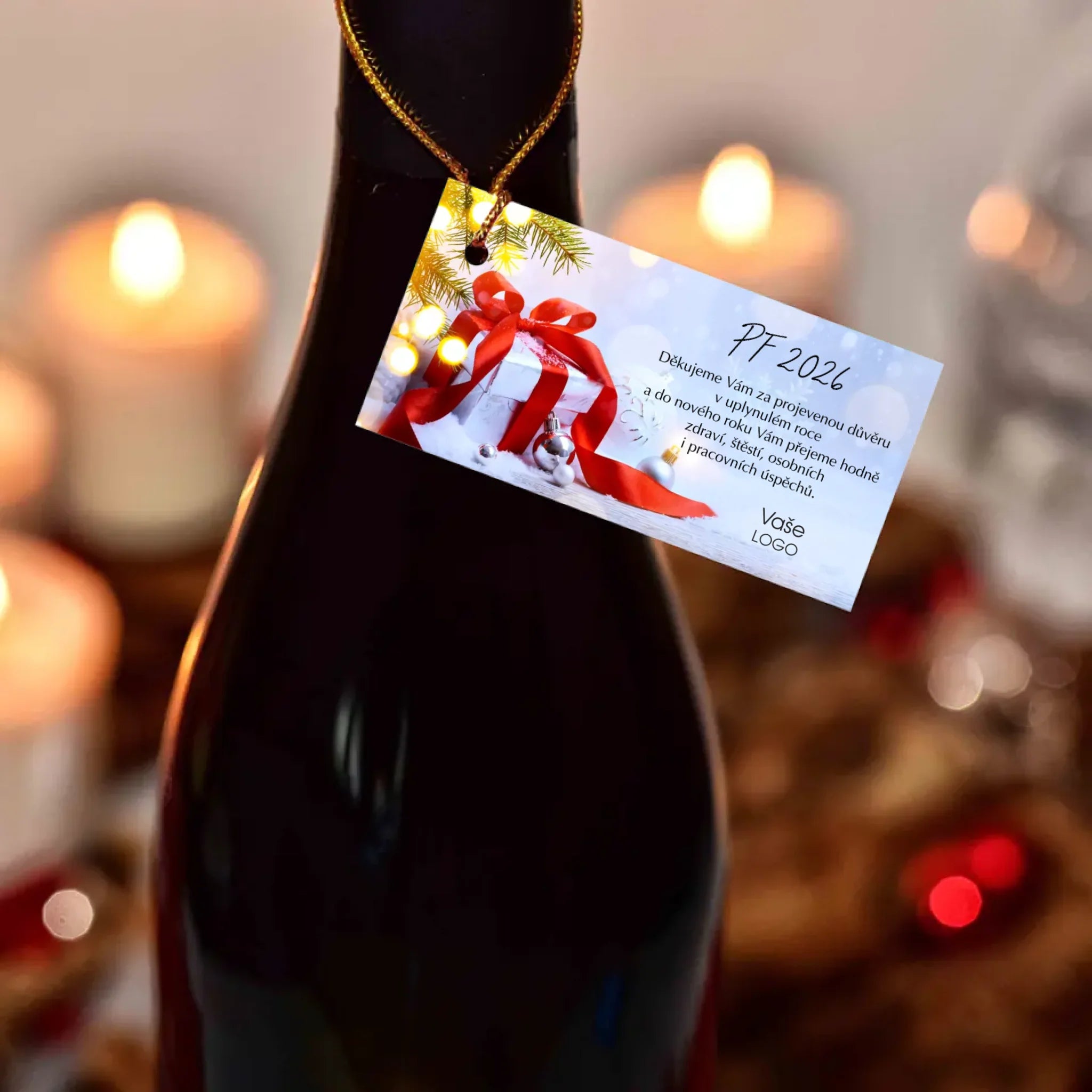 Visačka na láhev vína nebo sektu, kterou lze také použít přímo jako novoročenku pro Vaše obchodní partnery. Vybrat je možné z několika stovek originálních vánočních motivů, vybrat text, nahrát Vaše firemní logo a zbytek nechat na nás.