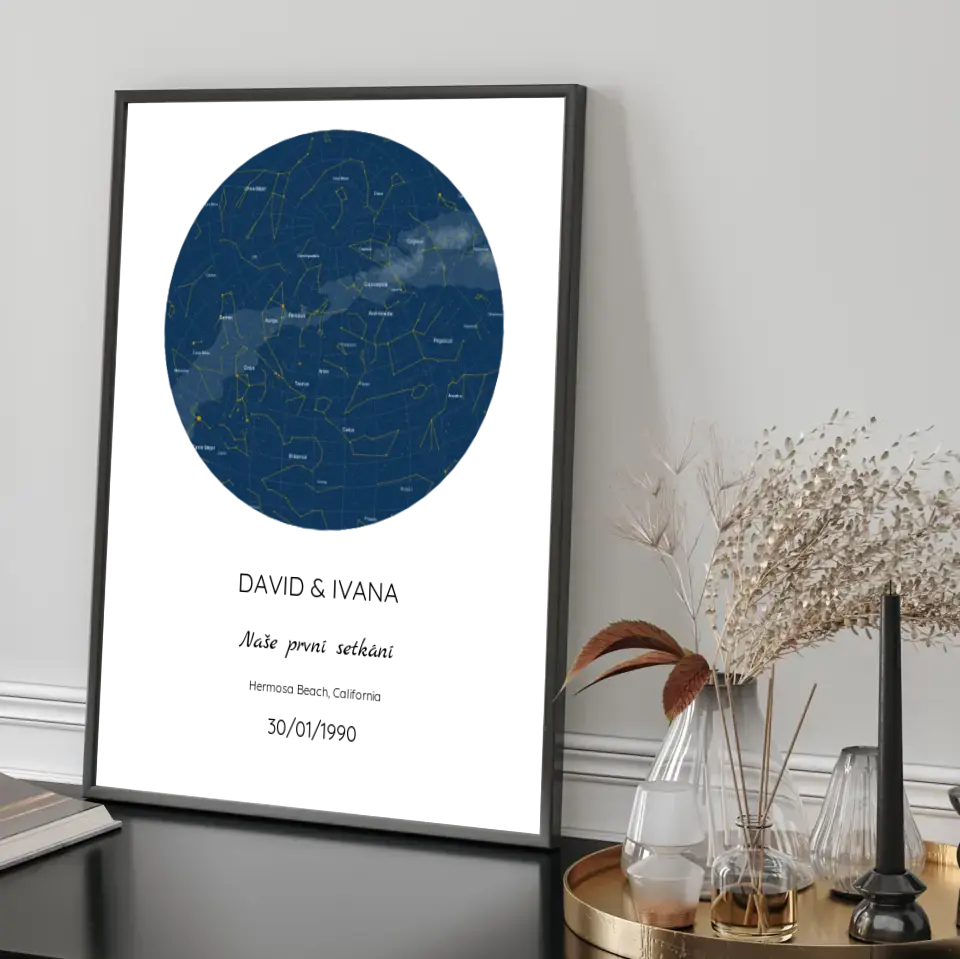 Vytvořte si vlastní plakát s hvězdnou mapou a Vaším místem. Náhled uvidíte v reálném čase přímo na vašem monitoru.